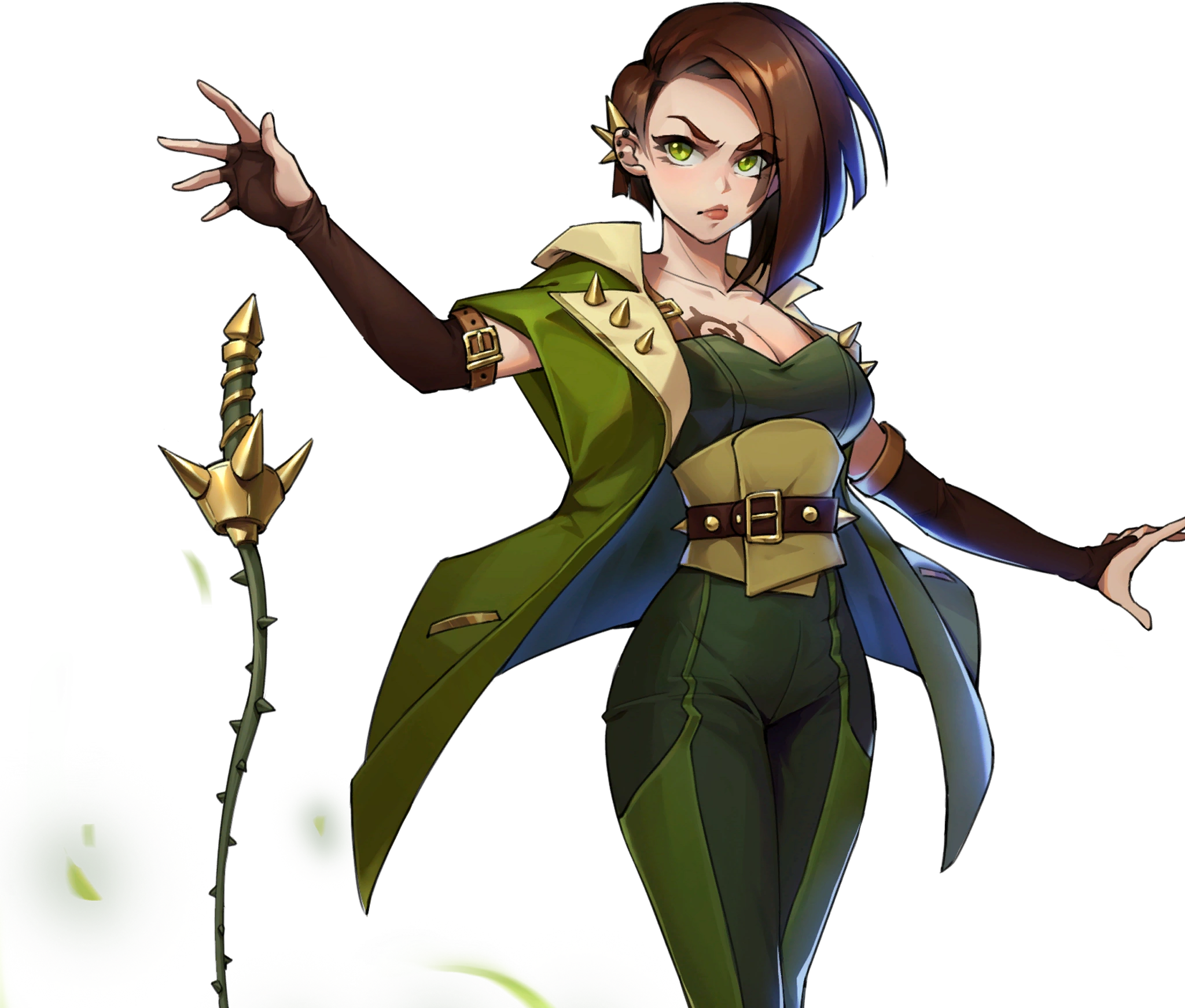 胸元が露出したタイプのジャンプ・スーツを着ており、それを金のバックルが付いた茶色のストラップで吊っている。胴回りにはカーキ色のコルセット・ベルトを巻いており、その上から金のトゲの装飾が付いた茶色のベルトをしている。ジャンプ・スーツの上には、小麦色の襟が付いた、濃緑のスリーブレス・ジャケットを着ている。腕には肘まで覆う、ダークブラウンのフィンガーレス・グローブをしている。靴は、膝丈の茶色のブーツである。