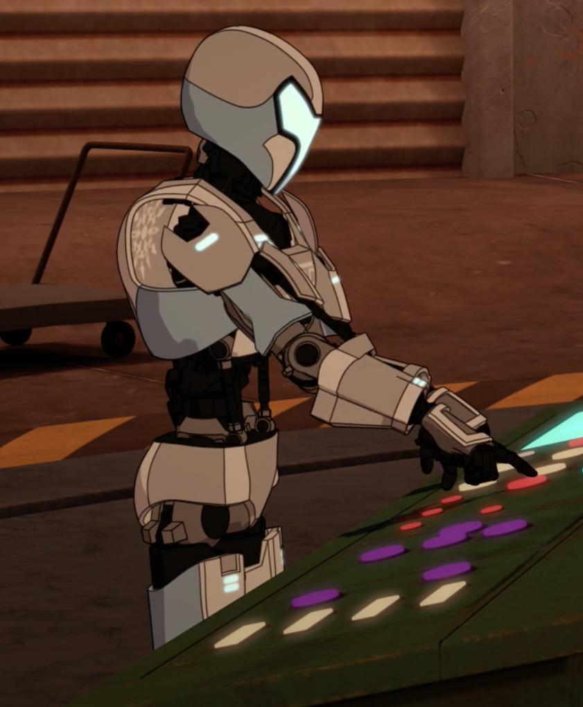シンダー・フォールによってコンピューター・ウイルスに感染させられた時に、黒い面頬や体の一部が赤く発光した。