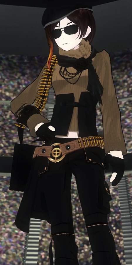 黒薔薇飾り付きのブレスレット、黒のグローブとネックレスなどたくさんのアクセサリーをつけ、ダークブラウンのベレー帽、黒のワイヤー・リムのアビエイター・サングラスを着用している。ストラップが弾帯になっている金スタッド付きの黒のショルダーバッグを持っているが、これは黒と金色の特大ガトリングガンに変形する。