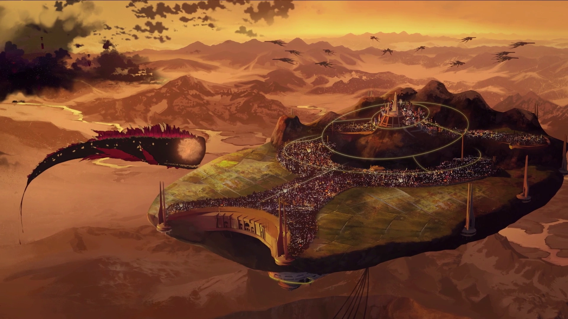 モンストラの翼のような胸ビレの下にあるエラに似た部分には、セイラムの部下が飛行船を使うための骨のような離着陸場がいくつもある。離着陸場の床は骨のような構造物でできており、また大きなテンペストに囲まれているようにも見える。