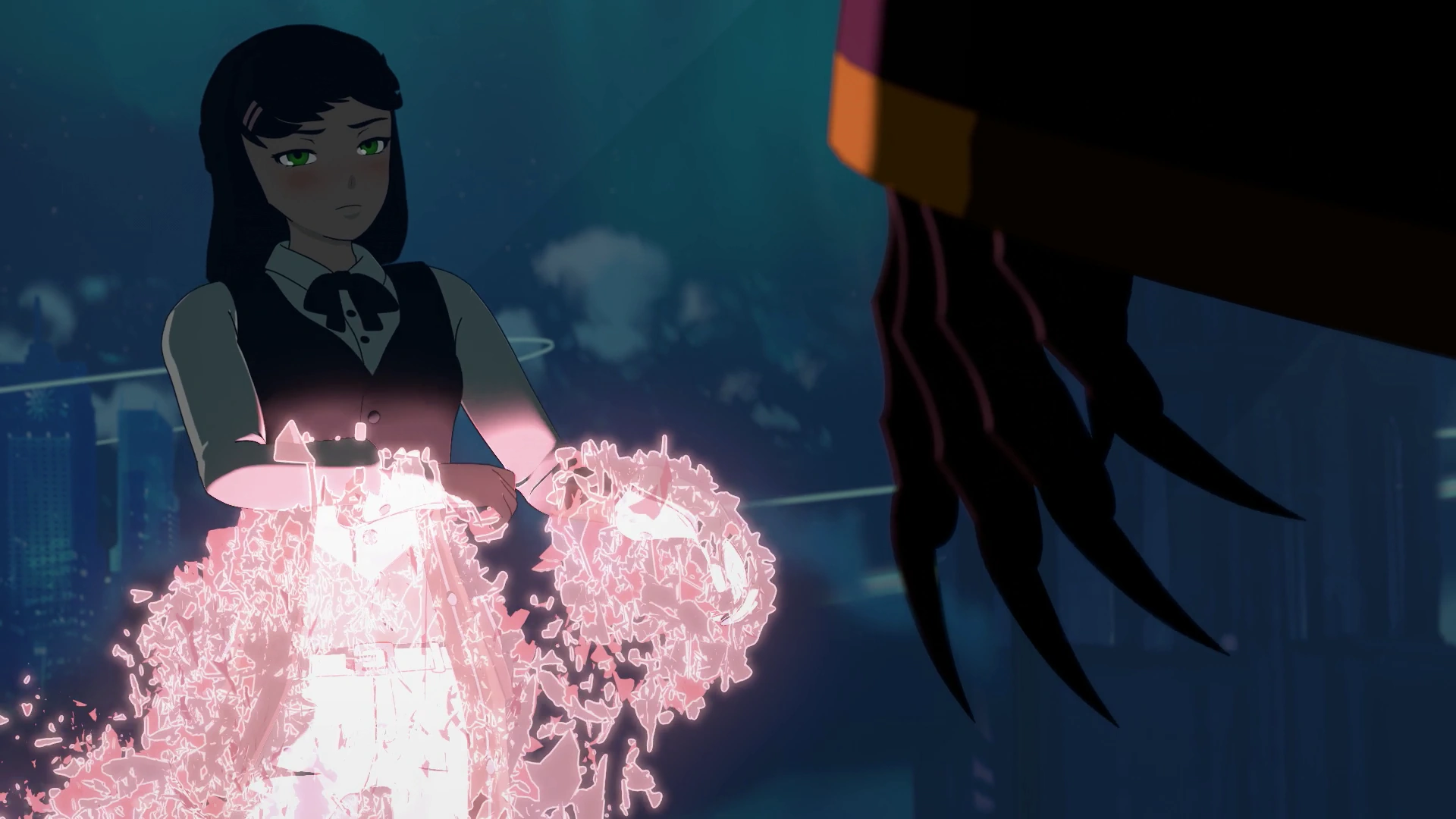 In the Atlas Medical Facility, Penny and Winter fight against Cinder, who violently takes the fight outside of the building in a fit of anger. There, she breaks Winter's Aura and returns to the facility while Penny saves Winter from falling to her death.