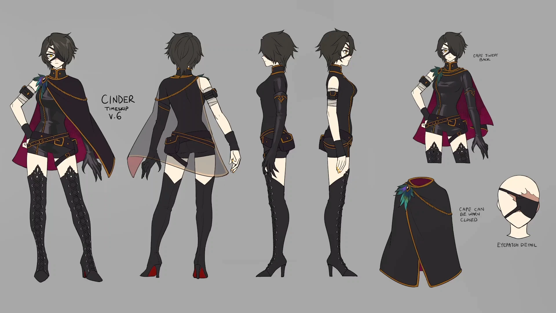 Cinder's Atlas outfit had little change from concept to final show model. However, the concept art shows Cinder's nails were painted yellow and her cape's interior was a wine red in color. In the final, her nails are unpainted and her cloak has a black interior matching its exterior.