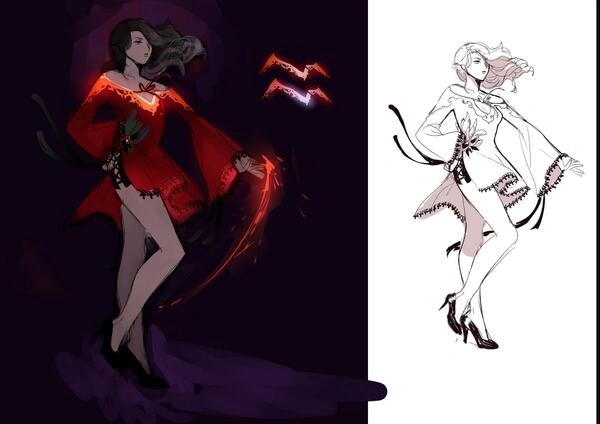 The concept art depicts her wearing a long-sleeved catsuit that is two tones of dark gray with black on the shoulders. Up her sides and partway onto her arms are black designs imbued with Dust, and on her back are more Dust-imbued designs in the same design as seen on the back of her original battle outfit. Around her waist is a belt with a pouch on the back for Dust. With this outfit, she appears to wear knee-high, wedge heel, dark gray boots and a pair of long, black fingerless gloves that end partway up her forearms.