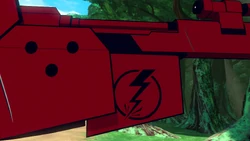 Crescent Rose is Ruby Rose's signature weapon. It is a High-Caliber Sniper-Scythe (HCSS) - a hybrid between a scythe and a sniper rifle. Ruby is first seen wielding it in the "Red" Trailer.