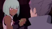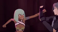 Mercury goes on to explain that his father physically and emotionally abused him, using "training" as an excuse to physically abuse him. As Mercury throws his fist and swings his leg at Emerald, he also reveals that Marcus stole his Semblance by using his when he unlocked it, claiming that it is a "crutch" that makes him "weak". Through false promises of being given his Semblance back, Mercury trained to become stronger, but never got it back, even after he killed his father. With nowhere else to go, Mercury aims to work harder to get where he is, proclaiming that he feels that he is right where he should be. Just as Mercury finishes speaking, he raises his arms as he and Emerald circle around the room, ready to strike at each other.