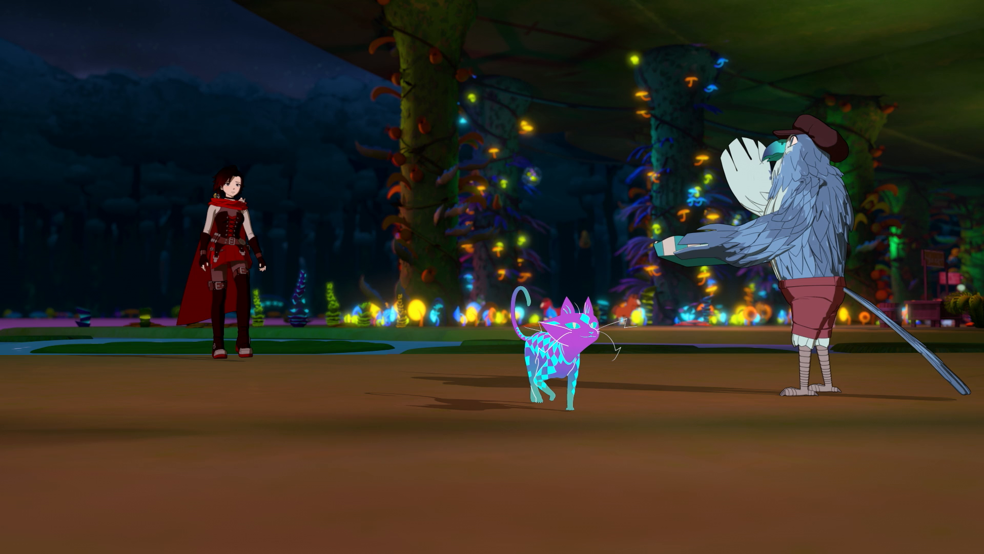 Team RWBY and Little following the Curious Cat through the Garden's Acre takes them to the Garden where they can hopefully acquire ingredients for a Growgurt Parfait. Due to the complex list of ingredients the Cat offers to go find them for the group. But knowing the Cat's distracted personality, Yang, Blake, and Weiss go with them to make sure they stay focused. Ruby is left with Little to locate the last ingredient from the Teapot Lady.
