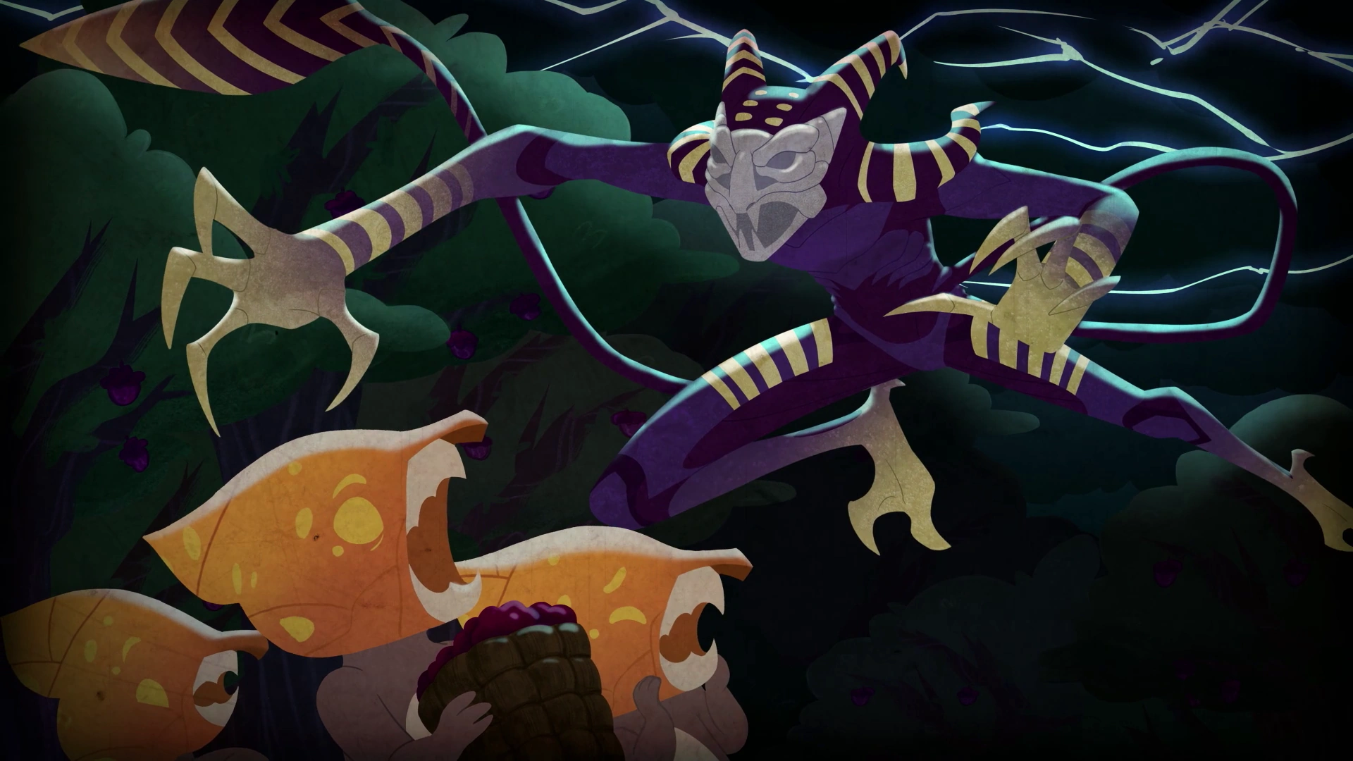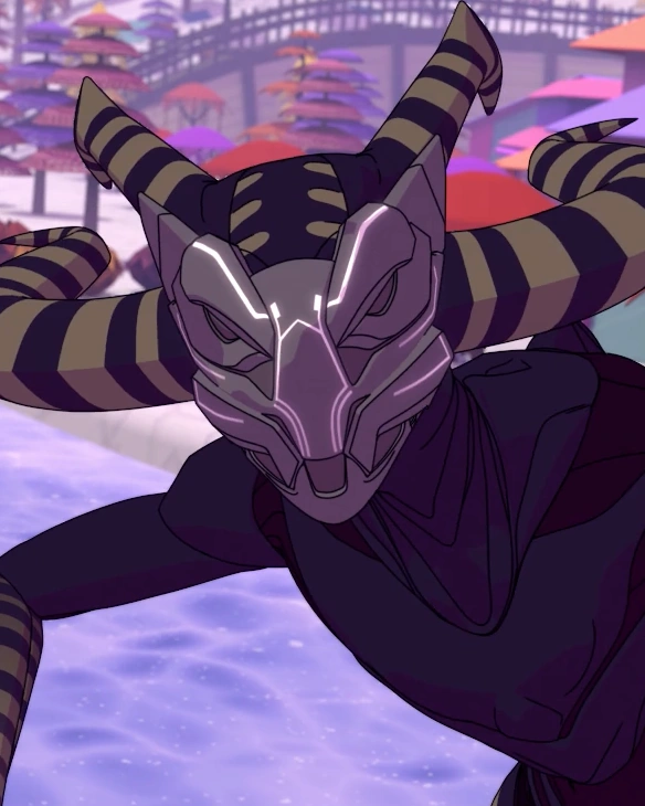 The Jabberwalker is an extremely tall, humanoid creature with a dark purple, almost black body. Its physique appears emaciated with a pronounced spine, collarbone, shoulder-blades, ribcage and pelvis. There are two sets of purple and dark-yellow striped horns sprouting from the back of its cranium and lower skull. There are dark-yellow stripes on its hips and on the forearms. Their hands and feet are the same dark-yellow color as the stripes. It has four digits on each hand and three digits on each foot, each ending with a pointed claw. It has a long tail that starts thin and fans out close to the tip, adorned with more dark-yellow stripes. On its face it appears to wear a grey lupine or reptilian masque with white highlights.