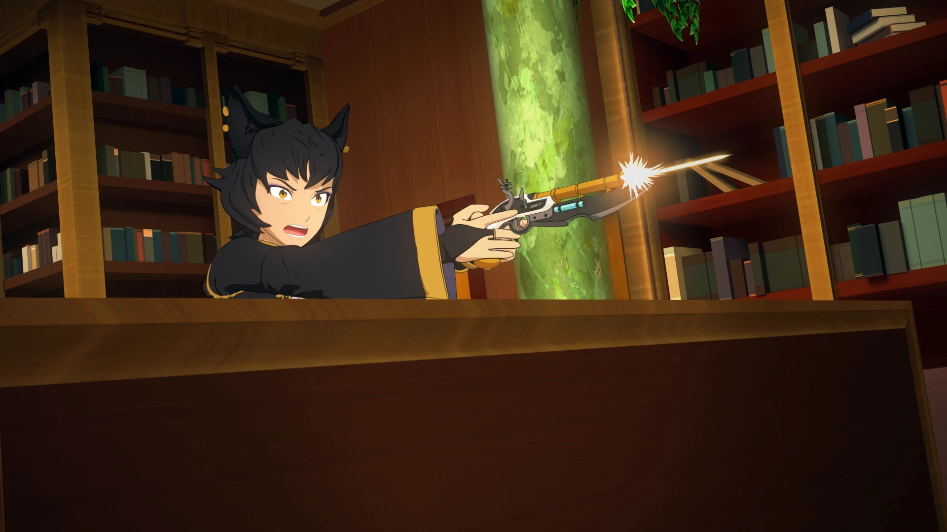 At night, Kali encourages Blake to have a talk with her father in his study. She hands Blake a tea set instead of delivering it herself and departs to chat with Sun Wukong about what Blake has been up to with Team RWBY.