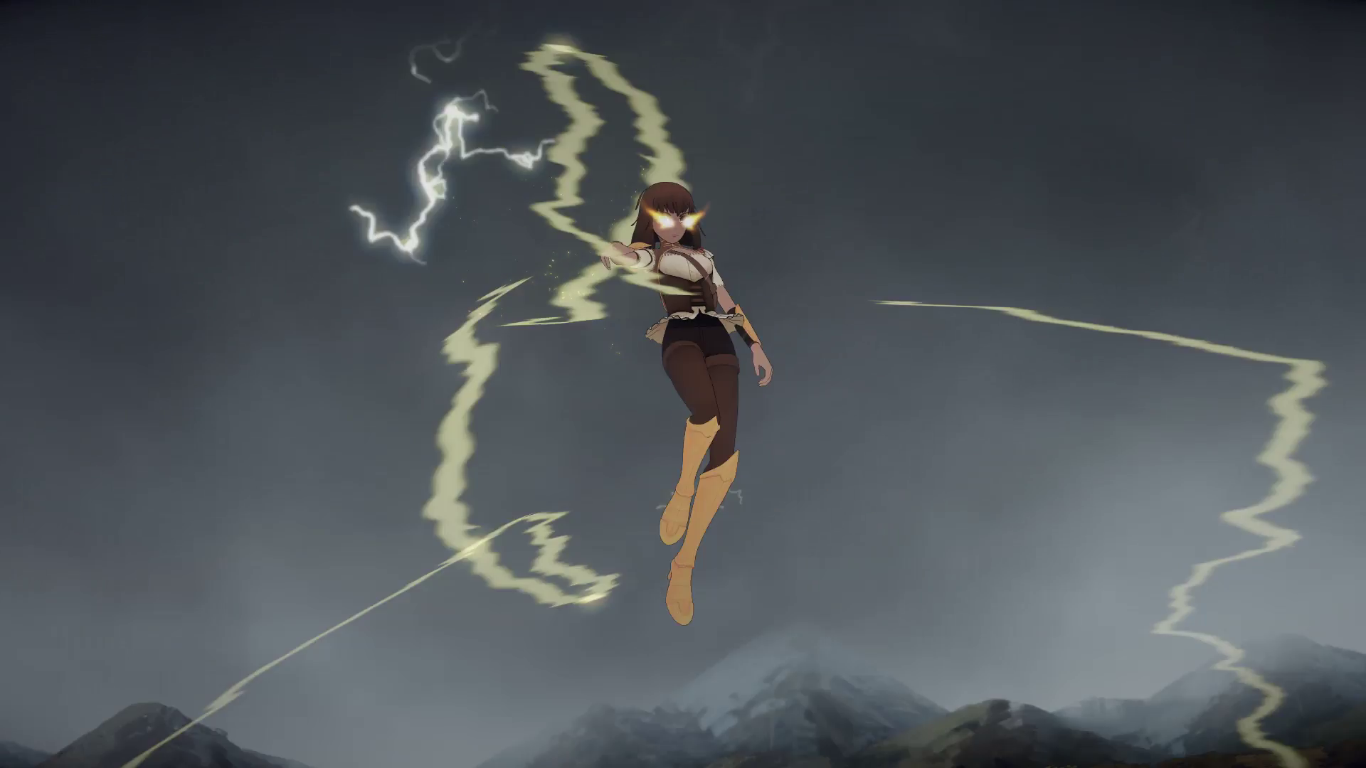 In "Downfall", during Raven's fight with Cinder, she makes use of several different elemental powers. She can generate ice, either by condensing it into weaponry, forming ice spikes or freezing from a distance. She can also generate electricity from her hands, using them to supercharge her weaponry, release it in close-ranged strikes, and generate fields of electricity around her. Lastly, she demonstrates the ability to fly, which she has been able to use additionally to propel herself at high speeds.