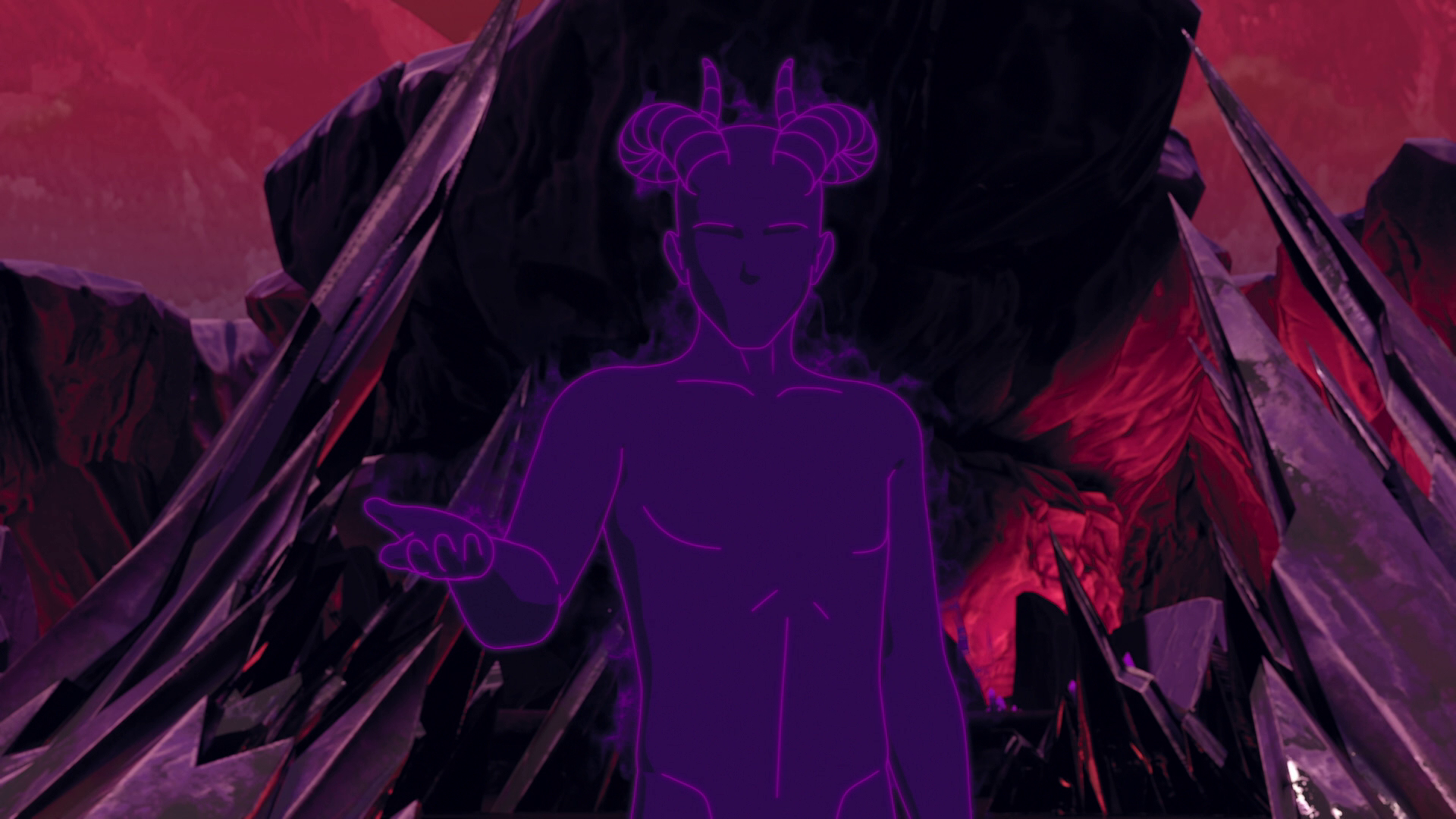 In his humanoid form, the God of Darkness appears as a purple male with curved horns. In his draconic form, he resembles a real-world Western dragon.