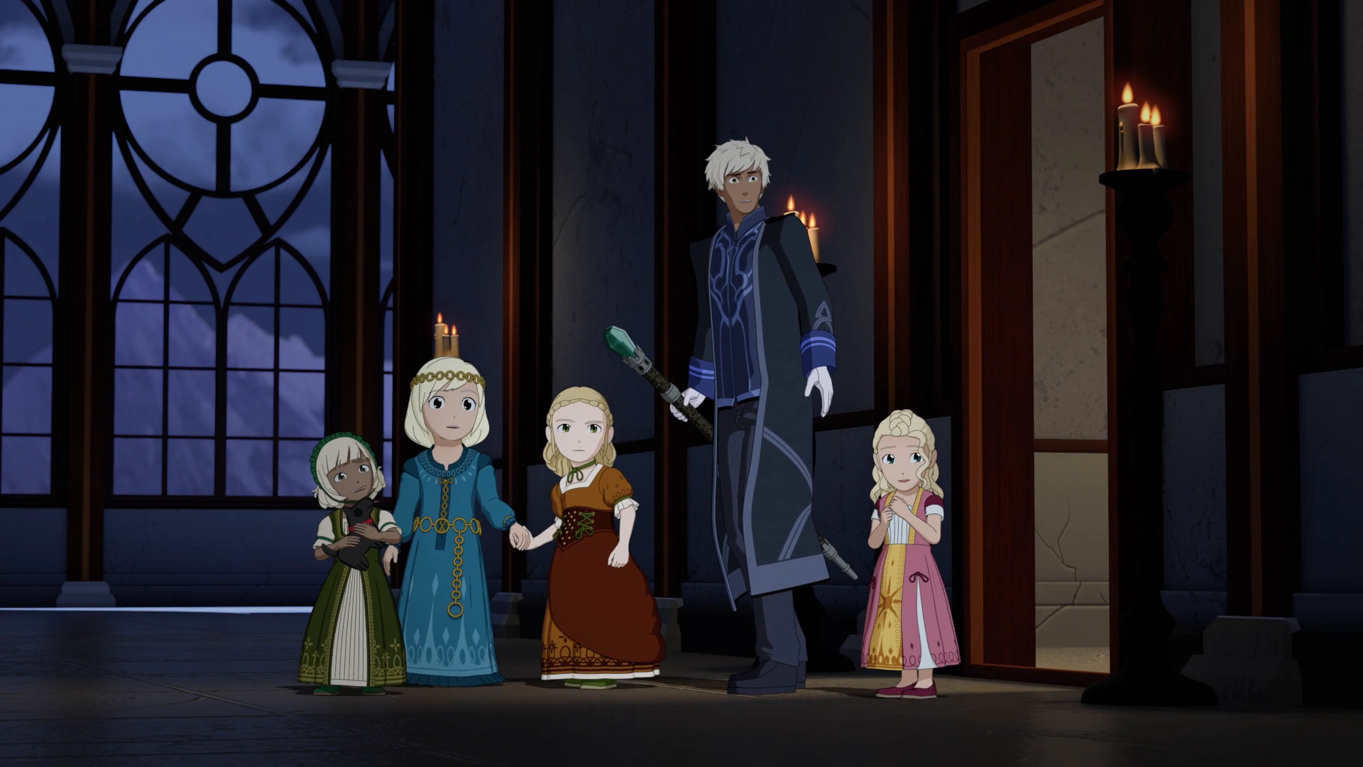 The sisters wore dresses reminiscent of the four Maidens; blue (Winter, who also has ice crystal-like details), pink (Summer, whose yellow skirt also has a big Sun), green (Spring, whose bow and dress trimming also has a leaf-like pattern) and orange (Fall, with the upper parts in brown, similar to Amber's clothes).