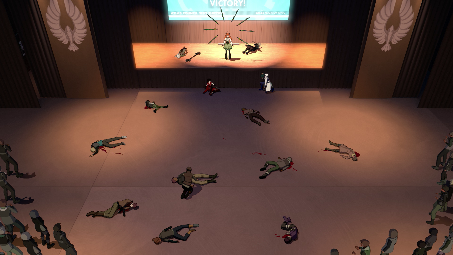 At the party, Penny greets Ruby, Nora, and Ren, and when she asks where the others are, Nora insinuates a romantic relationship between Blake and Yang, a notion Ren rejects, both using language that suggests their own relationship as well, furthering their argument. Ruby and Penny decide to leave them be, then find Marrow who reminds Penny she is working and not going out with friends. The election party Robyn chose to attend is crashed by Tyrian Callows, who massacred partygoers and framed Penny for murders, putting the blame on Atlas.