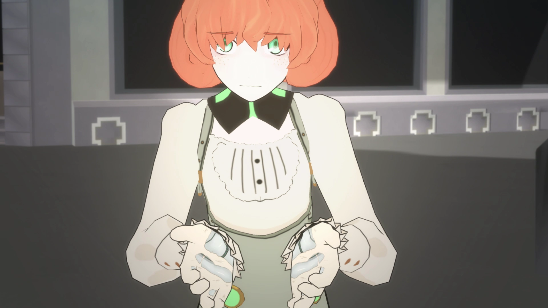 Klein Sieben tends to Nora, who awakens just as Ruby, Weiss, Blake and Whitley Schnee rush a badly-damaged Penny into Weiss's room. Klein isn't sure whether he can adequately repair the damage, but will do what he can. Unfortunately, at that moment the power goes out. Mat, on her way back to the Mantle Crater to help the refugees, calls them to confirm that Atlas just took another major hit. Ruby apologizes that they aren't doing more to help, but May tells her not to beat herself up, saying she doesn't know how much help they are able to give, at this point.
