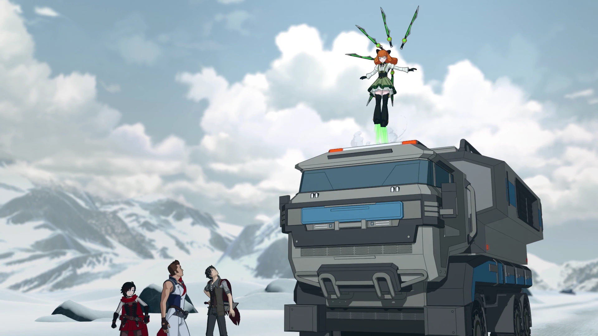 During a mission, Penny, Clover Ebi, Ruby, and Qrow's transport is stopped by Robyn Hill and her Happy Huntresses. Robyn questions what supplies supposedly destined for Mantle's wall are doing so far away. When Clover tries to brush off her concerns, Robyn reveals that she knows Amity Arena is at the Schnee Dust Company Mine #2 and questions its attention in light of the length of time before the next Vytal Festival. Ruby tries to justify the project without disclosing details, but Clover stops her, leading to a stand-off.