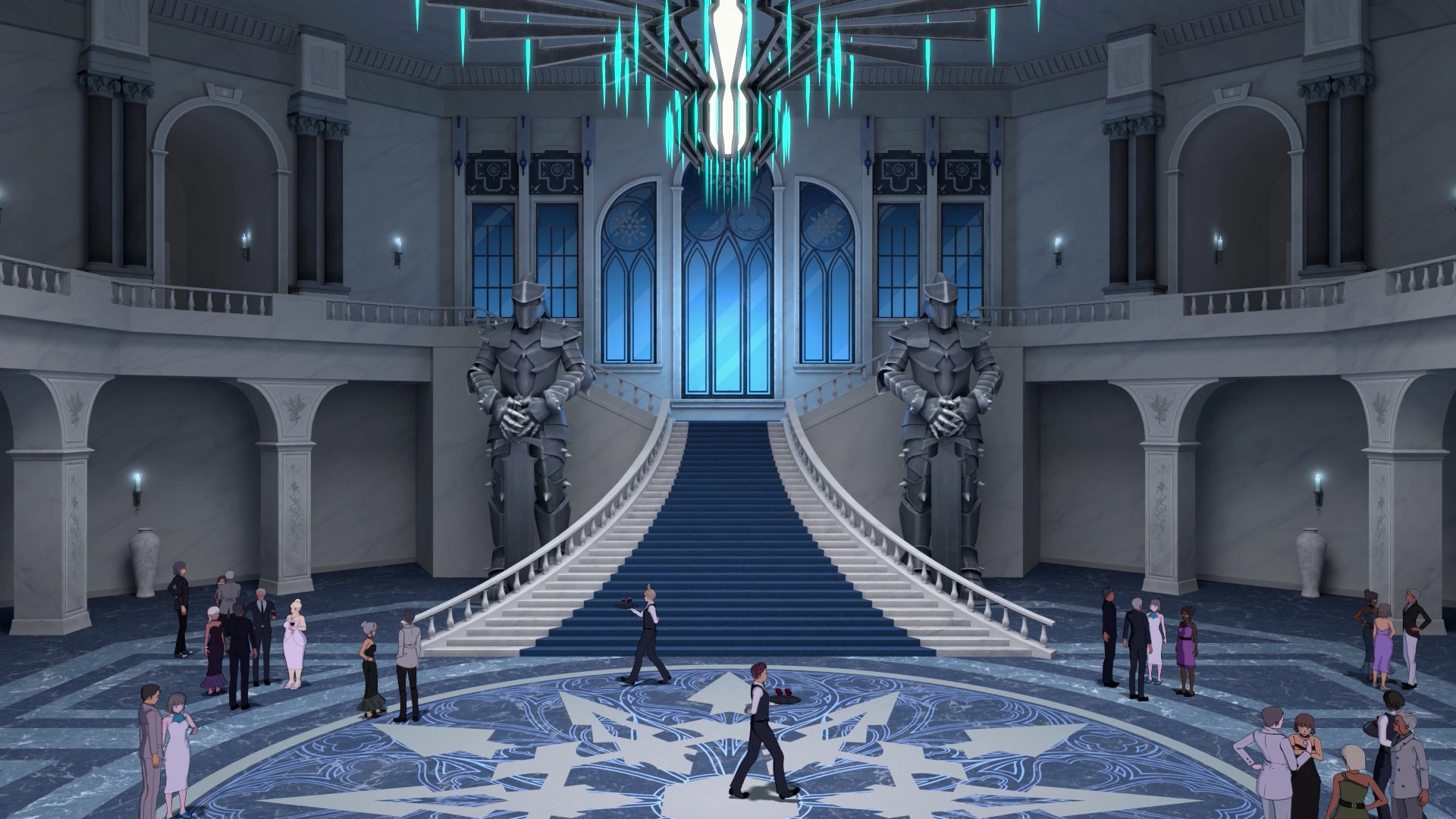 The courtyard led directly to the main entrance hall with a large stairway that led to the rest of the house. A wide stairway with curved balconies on both sides allowed passage to the ground floor. At the top of this stairway was a paned triptych of arched windows, and on both sides of the stairway stood enormous white suits of armor designed after the Schnee family patriarch Nicholas Schnee. The floor at the bottom of the steps beared a large, blue, circular pattern decorated with the Schnee snowflake emblem in various places. The ceiling of this room beared the same blue, circular pattern.