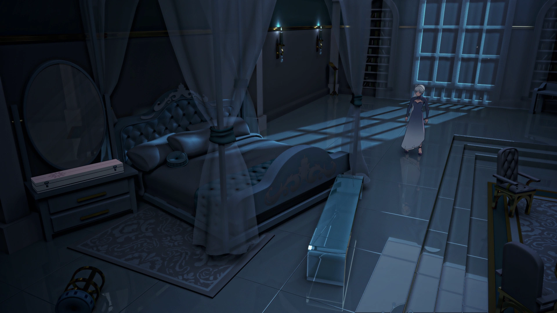 Weiss' room, much like the rest of the house, had white walls and a white reflective tile floor. The white ceiling formed an arch, and a little over midway up the walls was a thick blue border with gold edges. In a few places around the room were arch-shaped bookshelves attached to the walls. The room had gold sconces with blue teardrop beads hanging from them.