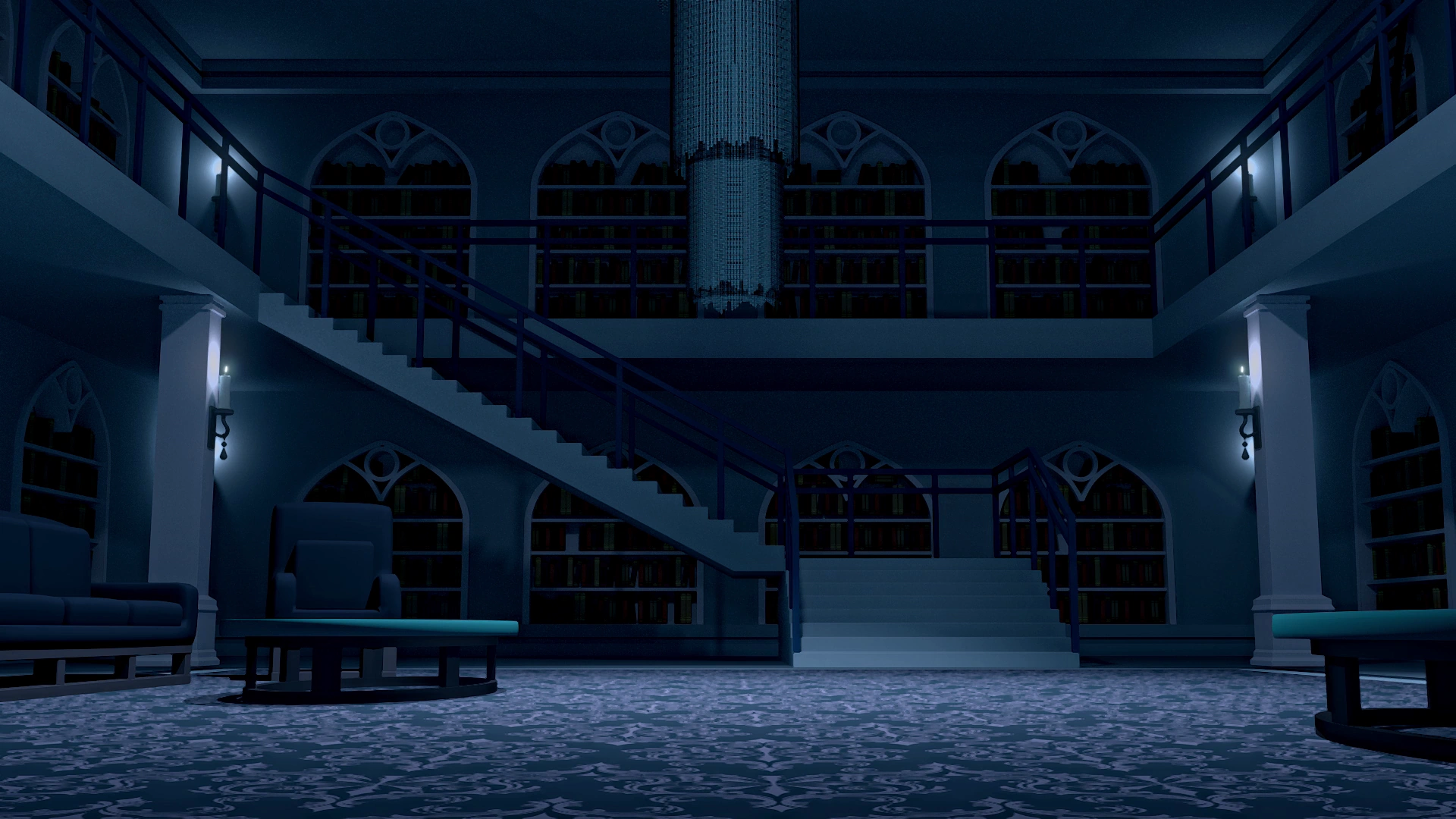On the first floor of the manor was a two story library. Bookshelves set into alcoves line the walls of the room on both levels, and the center of the first floor was set with multiple lounges, chairs and low tables. A large rug covered the ground, and a multi-tiered chandelier hung in the center of the room. There were a few pillars holding up the walkway for the second story with wall candles on each and more in each corner of the room on both floors. A large staircase curved from the upper floor to the center of the ground floor.
