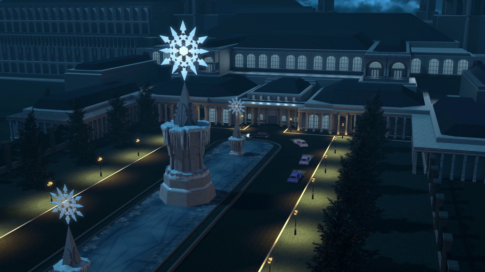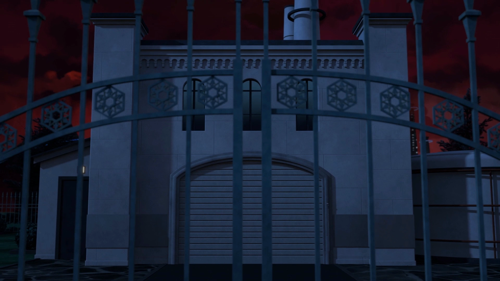 Schnee manor had a long driveway with three pillars holding up the Schnee Family crest.