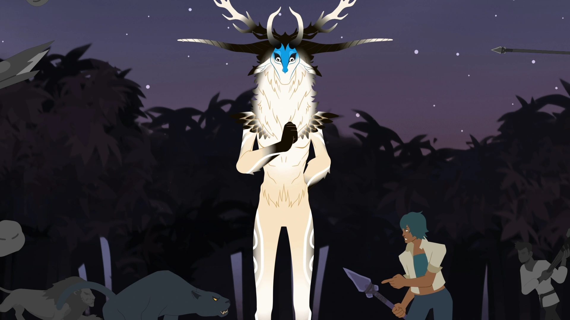 In RWBY: Fairy Tales, the God of Animals is portrayed as an enormous humanoid with white fur, six different horns, white and black gradient feather shoulders and no visible mouth.